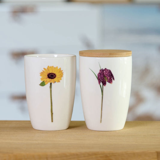 Die hochwertigen Porzellanbecher von der dänischen Firma Simply Flowers sind kleine Kunstwerke jeder für sich. Vorne sieht man die Blume und auf der anderen Becherseite die Knospe. Dazu haben sie noch einen Luftdichten Holzdeckel, was sie universal einsetzbar machen: Natürlich zum trinken, aber auch für Marmelade, Salz, Kräuter, als kleine Vase, für Stifte auf dem Schreibtisch oder im Bad für Utensilien. Die Möglichkeiten sind unbegrenzt.